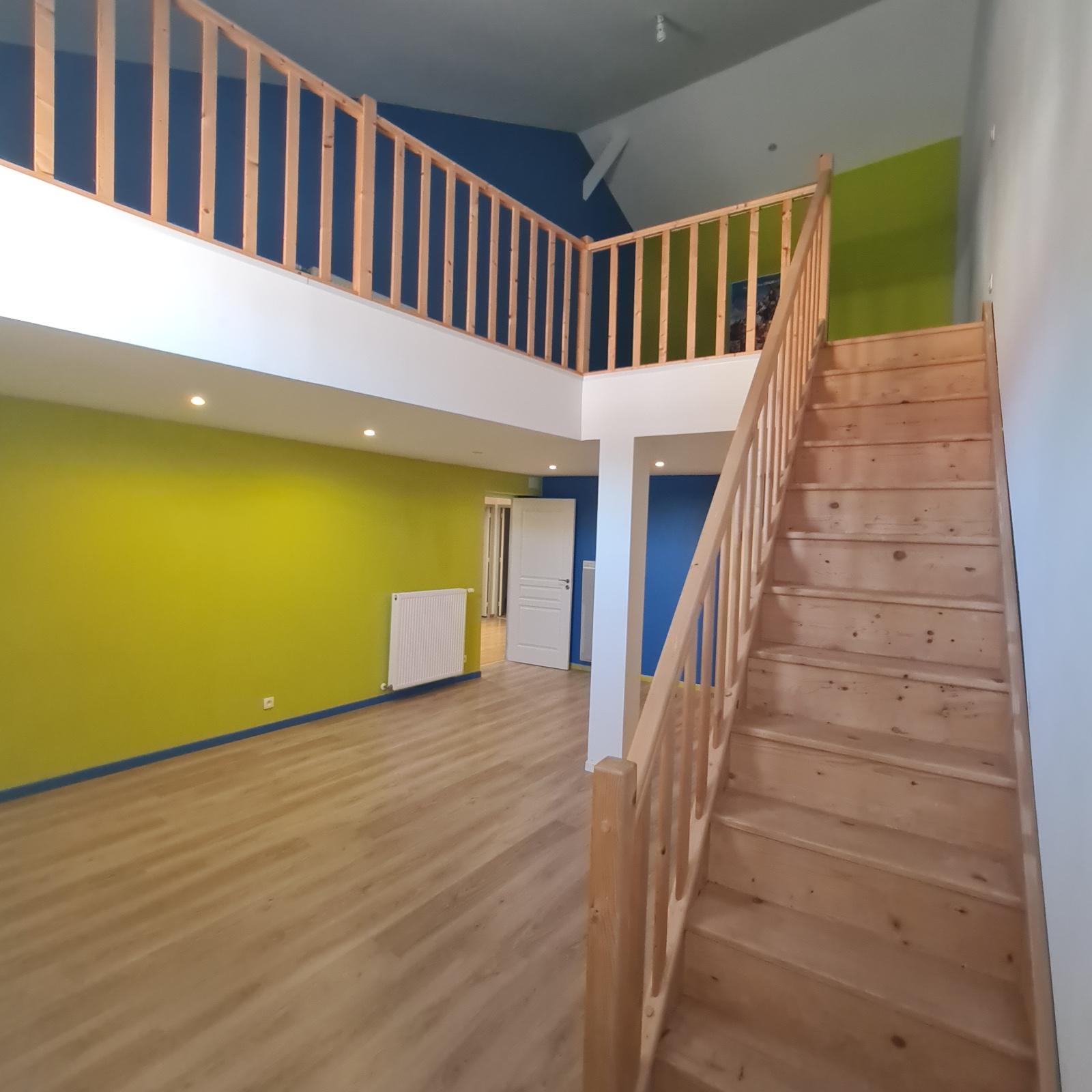 - Un petit couloir nous mène à un très grand espace qui a été aménagé plus récemment et qui propose : une chambre XXL en mezzanine , ainsi que deux autres chambres ou bureau à convenir ( la lumière n’est pas directe ) .