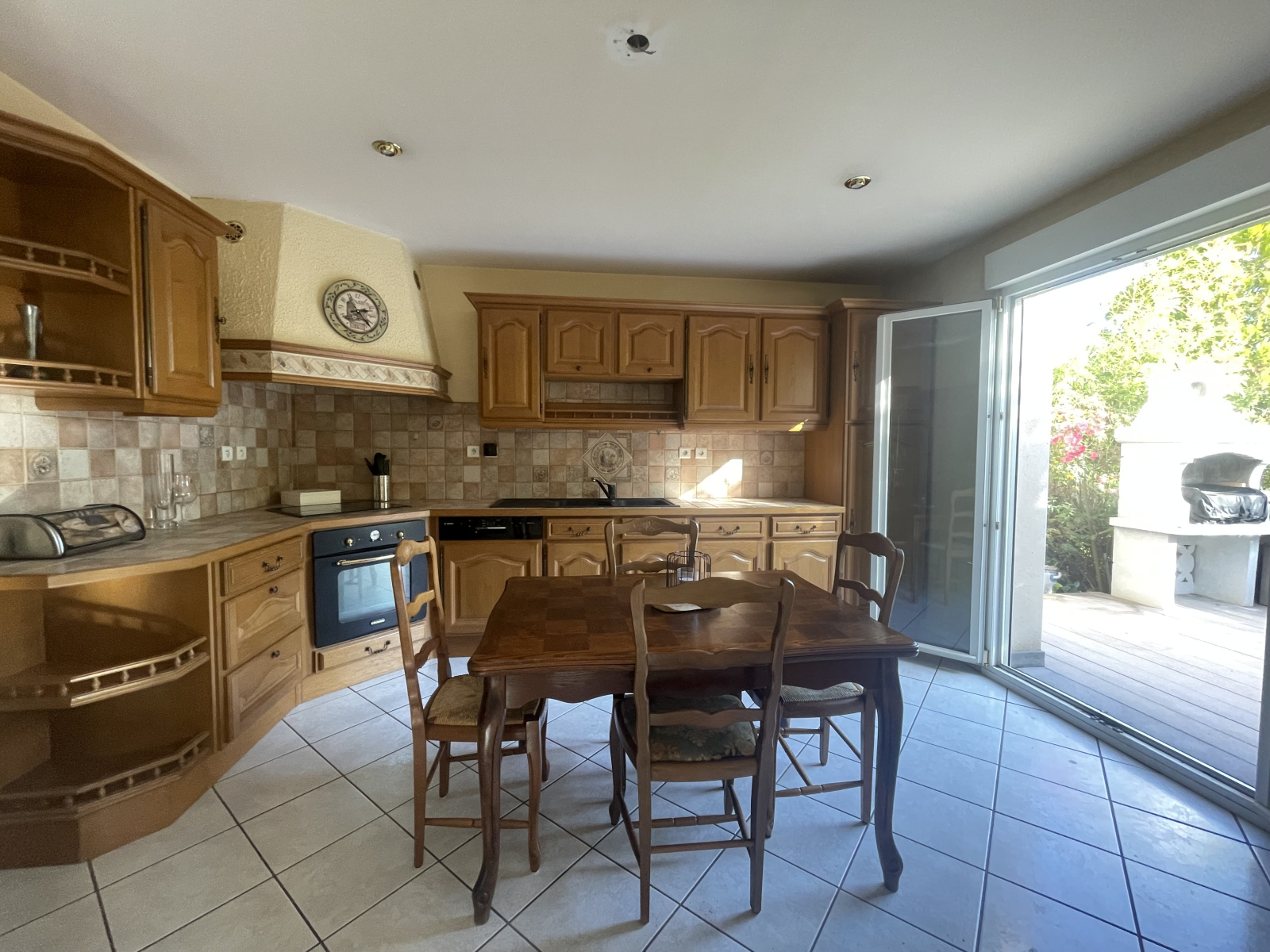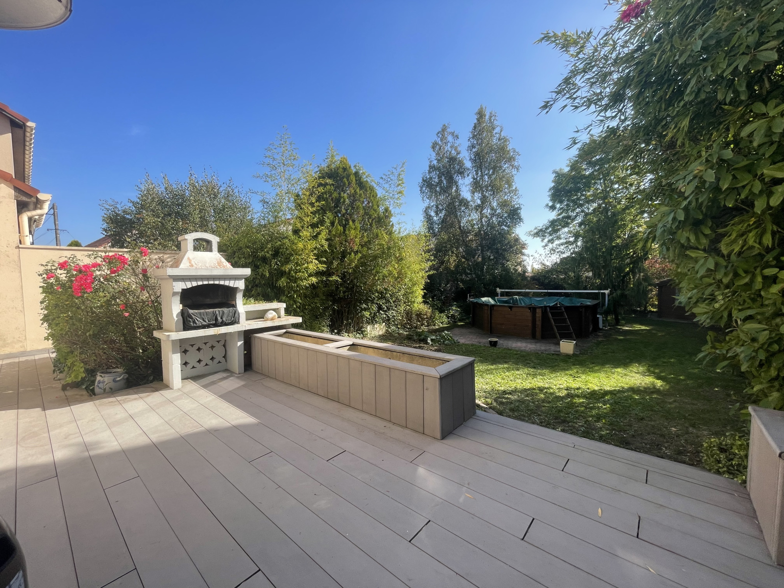 Au rez-de-chaussée vous trouverez une grande entrée, deux placards , un toilette, une cuisine équipée de 15m², un séjour de 38m² avec accès direct sur une grande terrasse de 50m² en bois et son splendide jardin boisé avec piscine et cabane de jardin