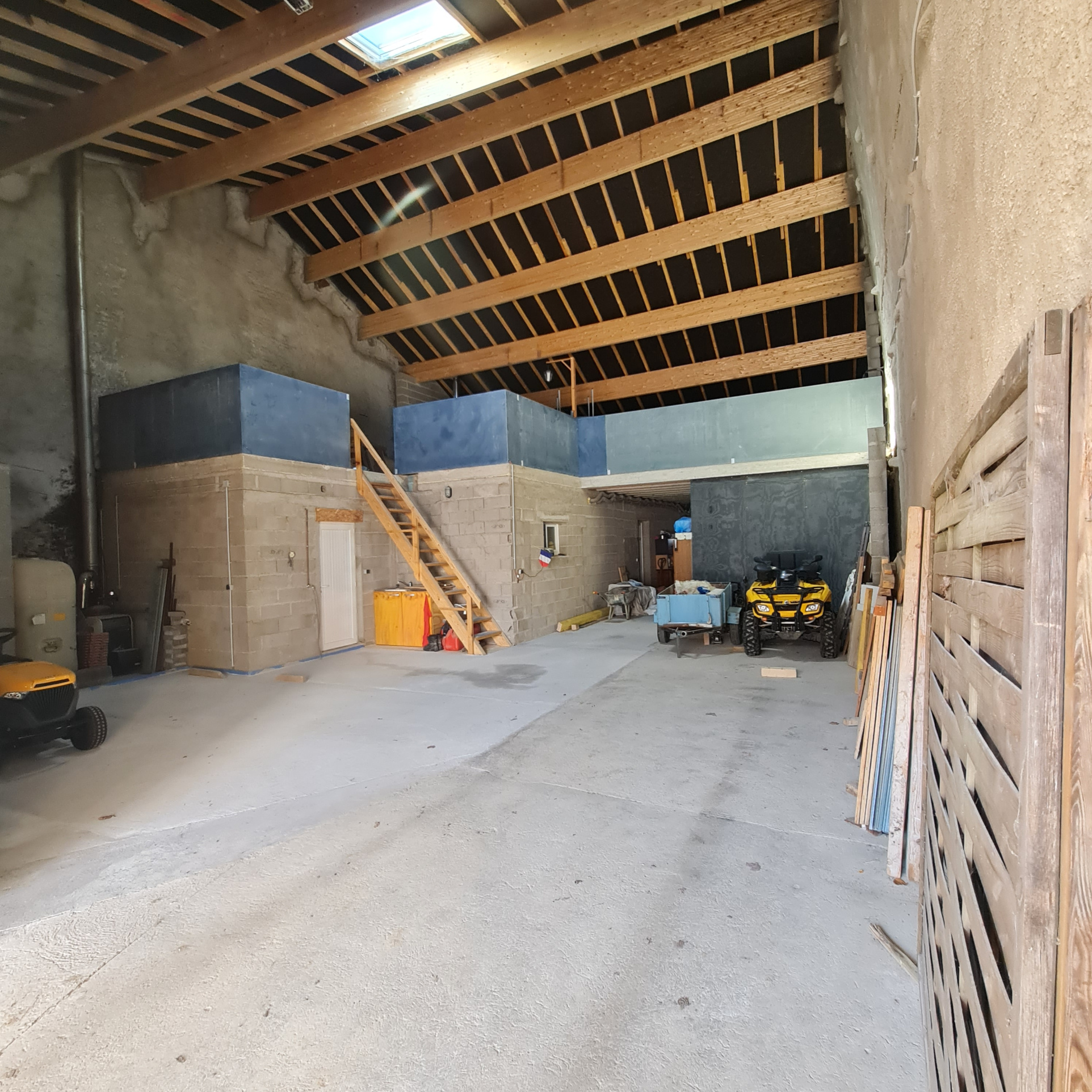 Un grand garage de 85 M² avec une hauteur sous toiture impressionnante permettant de garer sans problème plusieurs voitures, un ou deux camping-car par exemple.