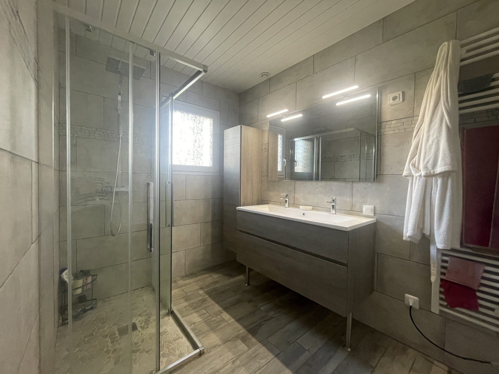 Une salle d'eau neuve avec douche et double vasque